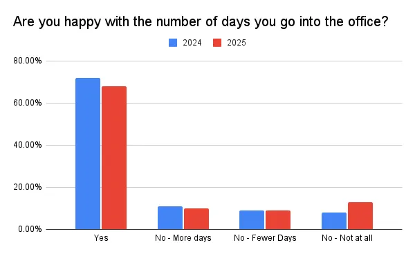 Finally, we asked our community if they were happy with the number of days they spend in the office. While the percentage of those who are happy has remained high, that number has fallen from 72% last year down to 68% this year. Those who were the happiest with the amount of time they spend in-office in order were those in-office full time, those in-office four days a week, and those who are fully remote. The group that was most likely to want more days in-office was those going in occasionally. Those going in three days a week were the most likely to want fewer days in the office. Those going in two days a week were the most likely to want to work fully remote. That percentage was so high, in fact, that it matched the percentage of those who were happy with how often they are in the office: 40%.