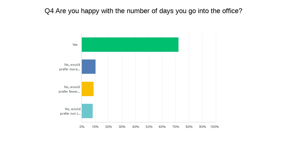 One of the much lauded pros of remote work is the flexibility that it offers. An important aspect of happiness about current working conditions revolves around how flexible our time in the office is. The groups who described having the most flexibility in their in-office working hours were those going in occasionally and those going in two days a week.